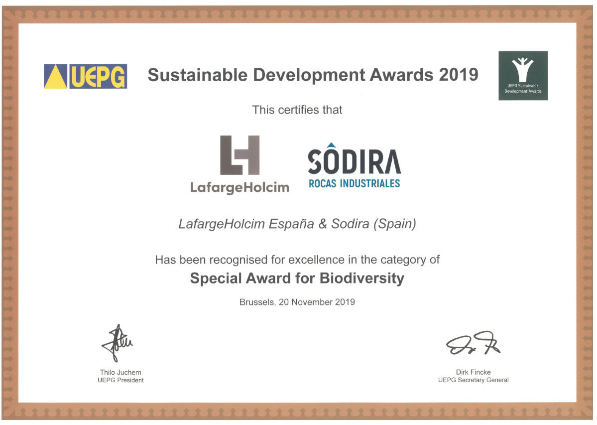 1 er Premio de Desarrollo Sostenible 2019 en la categoría Premio Especial a la Biodiversidad por Restauraciones en colaboración con LafargeHolcim otorgado por la Unión Europea de Productores de Áridos (UEPG).